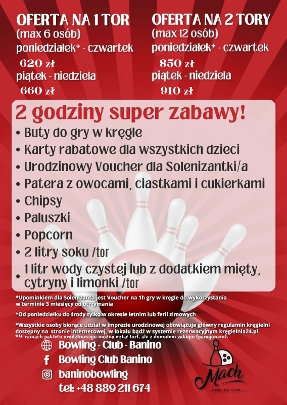 piątek: 17:00-24:00, kręgle – 89 zł/h,